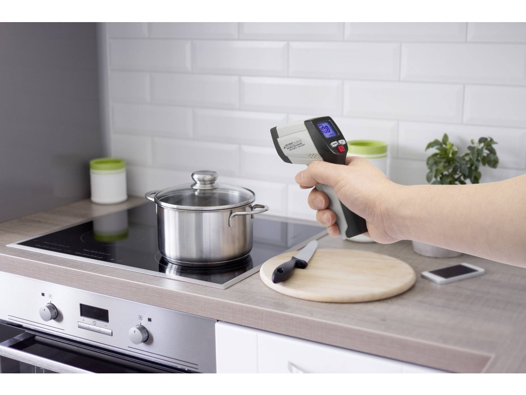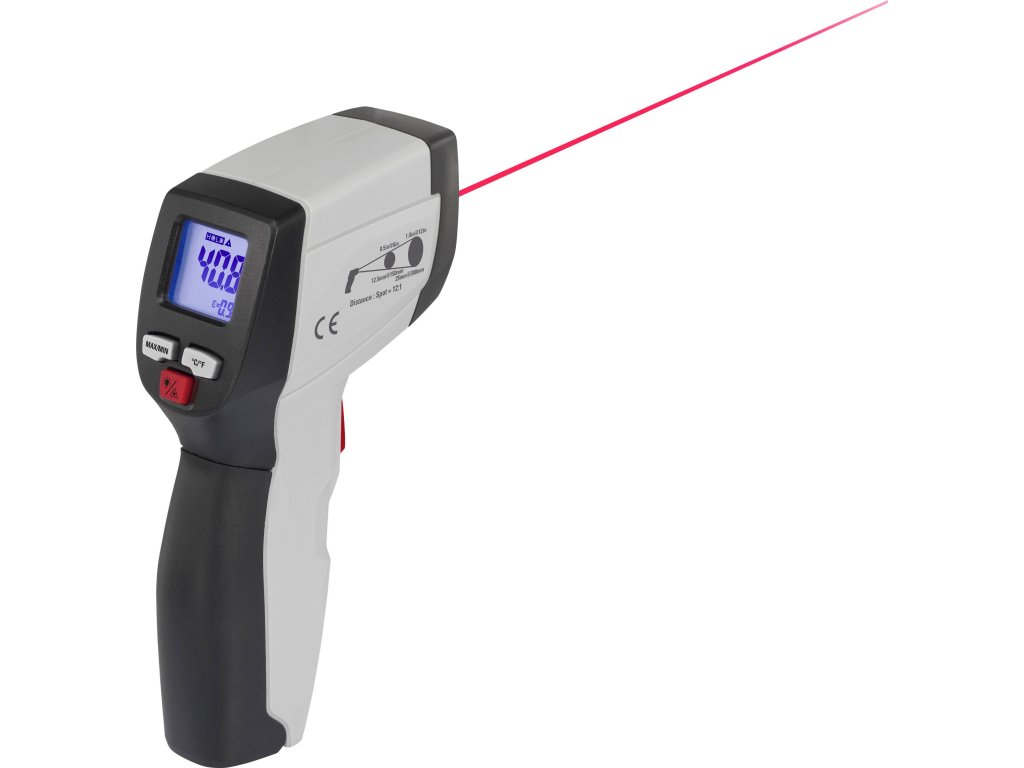 Odolný a praktický infračervený teploměr s pistolovou rukojetí pro bezdotykové měření teplot v rozsahu -50 °C až +500 °CVšestranný přístroj najde využití v domácnosti, při volnočasových aktivitách i v práci. Stisknutím tlačítka lze bezdotykově a bezpečně změřit povrchovou teplotu otáčejících se dílů, vodičů pod napětím a těžko přístupných či nebezpečně horkých předmětů. Díky širokému rozsahu měření a vysokému rozlišení má přístroj velmi široké spektrum použití. Umožňuje také zjistit problémy s izolací díky detekci malých teplotních rozdílů u venkovních zdí, dveří a oken. Možnosti použití IR teploměru jsou ale takřka neomezené i v amatérské a profesionální oblasti (např. kontrola teploty elektroinstalace, kontrola vytápění, monitorování bezpečnosti potravin atd.). IR teploměr je navíc ideální pro kontrolu více míst měření z jednoho stanoviště, což šetří čas a peníze.
