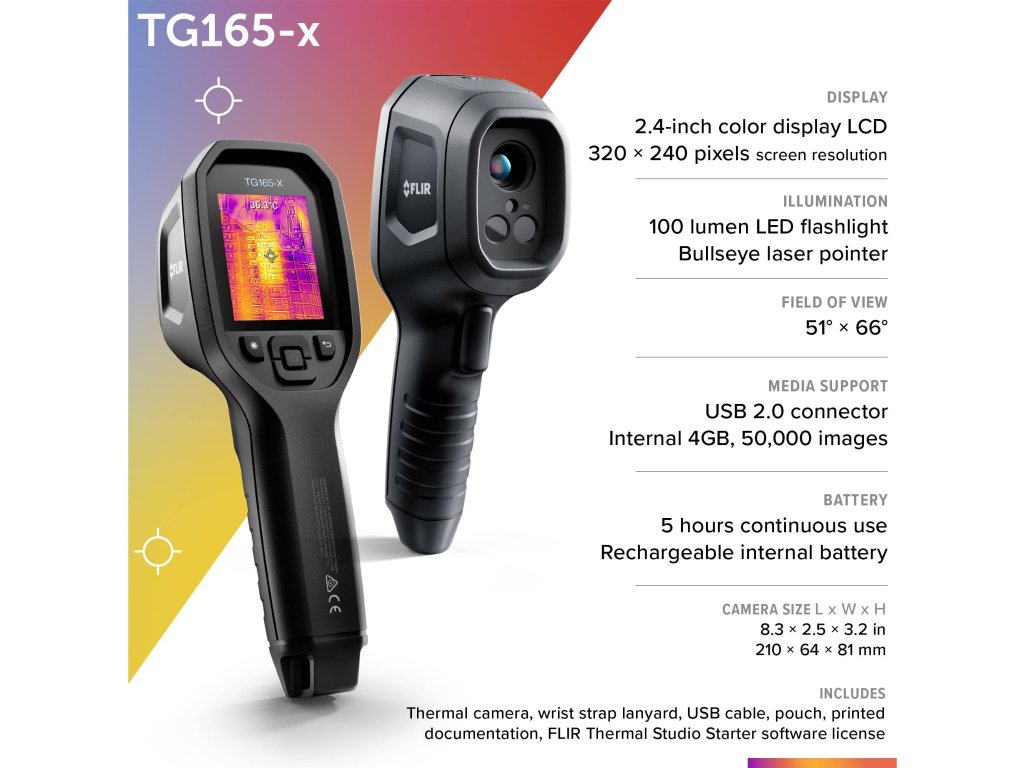 Termokamera FLIR TG165-X výrazně zkracuje inspekční a diagnostickou dobu, protože pomáhá vizualizovat zdroj elektrických, mechanických a HLK/R systémových chyb. Místo hledání teplotních anomálií pomocí IR teploměru v jednom bodě vám tento bezdotyková teplotní a zobrazovací nástroj zobrazuje tepelný obraz vašeho cíle, včetně všech horkých míst nebo chladných zón, které by mohly naznačovat nějaký problém. Díky patentovanému vylepšení obrazu MSX od FLIR S laserovým laserem můžete zajistit, že budete mít vždy ten správný prvek pro měření, zatímco design s pomocí snadno ovladatelných tlačítek a nastavení vám pomůže vyřídit práci rychle a bez stresu. S interní pamětí až pro 50.000 snímků. FLIR TG165-X je díky li-Ion akumulátoru ihned po vybalení připraven k použití.